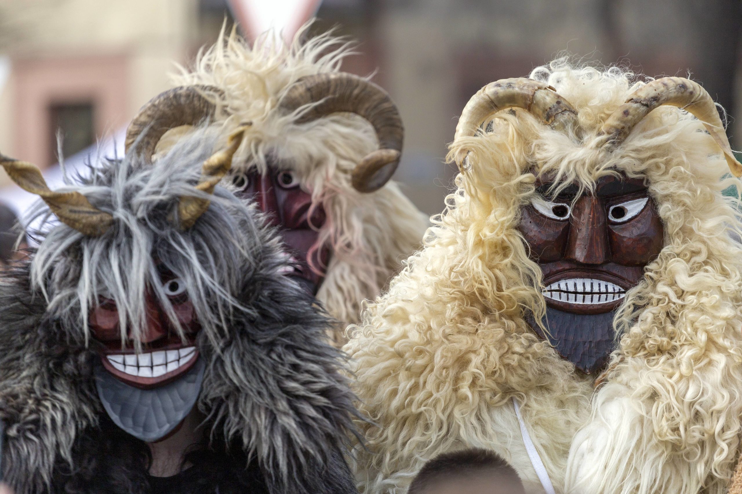 Busós are traditionally men wearing scary costumes, unique wooden masks and woolly cloaks made of sheepskin. They like to chase around and circulate among the crowd while pulling pranks and making a big noise as a symbol of scaring winter away. Although most Busós are men, women also participate and they dress up as female Busós, or they wear costumes reminiscent of female Ottoman Turks.